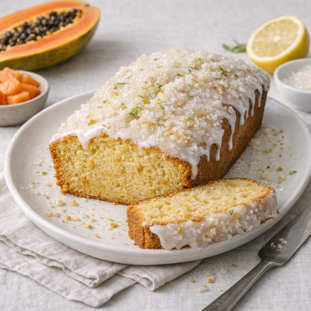 Descubra o sabor tropical do bolo de mamão com glaçagem crocante de açúcar — leve, aromático e perfeito para acompanhar o café da tarde.