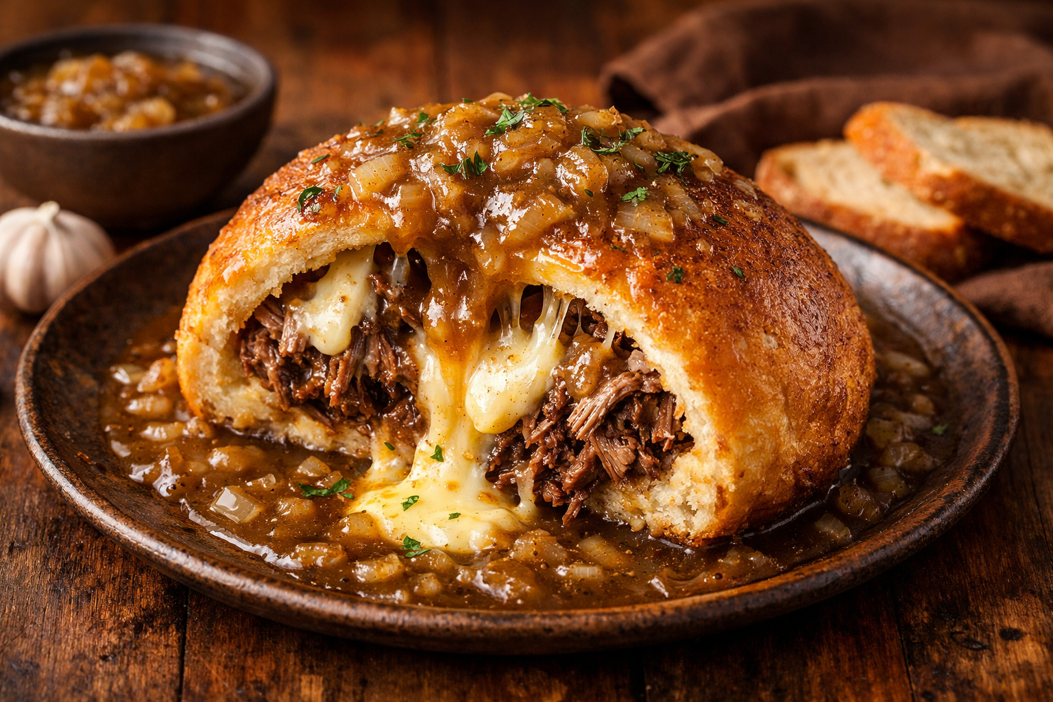 Uma explosão de sabor: carne de panela desfiada, queijo derretendo e um molho de sopa de cebola francesa que transforma tudo em uma bomba …