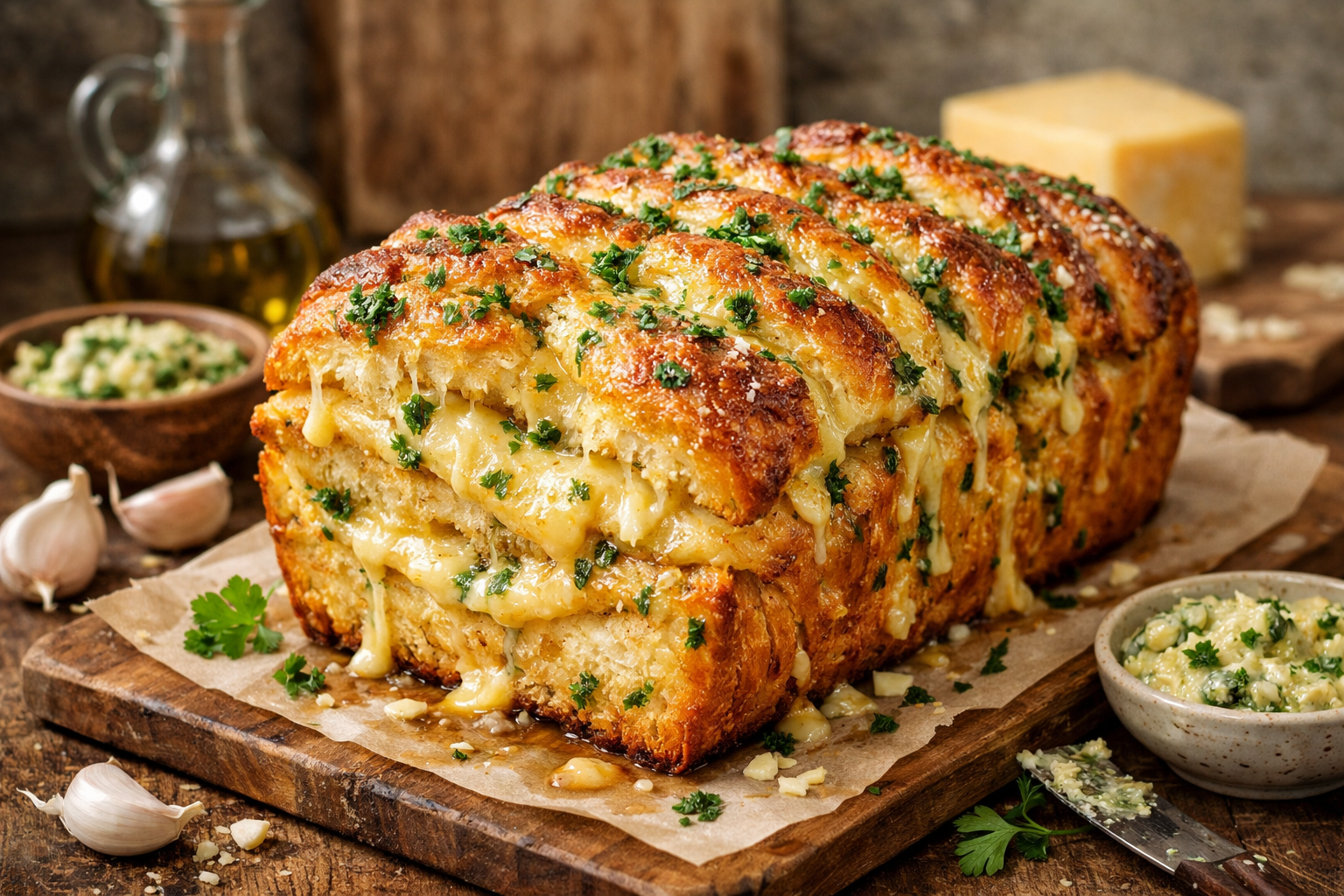 Pão de alho com queijo e manteiga de salsinha: massa macia, alho confitado e muito sabor em cada camada. Perfeito para servir quentinho!