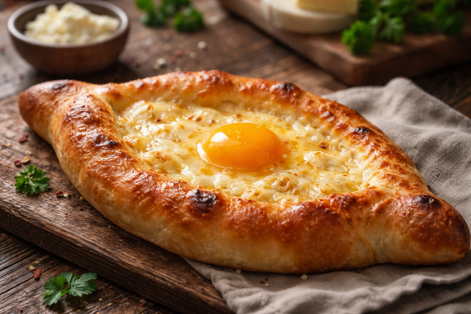 Descubra o khachapuri, o pão georgiano com queijo derretido e ovo cremoso. Uma receita irresistível que une textura, sabor e conforto.