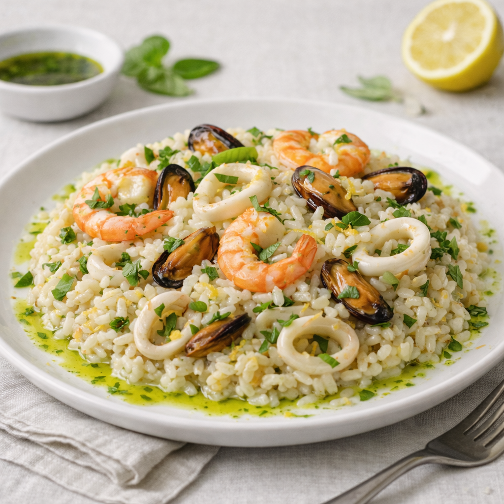 Risoto de frutos do mar com limão siciliano e azeite de manjericão — leve, elegante e cheio de sabor mediterrâneo.